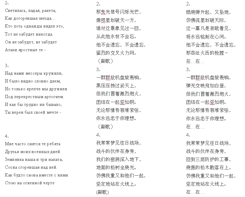 因为演唱基本上第一段就够了,所以主要对第一段进行了重点分析。后几段也有类似的问题,比如曳光信号、敌机、窑洞等词的译法问题,回头与大家慢慢讨论。