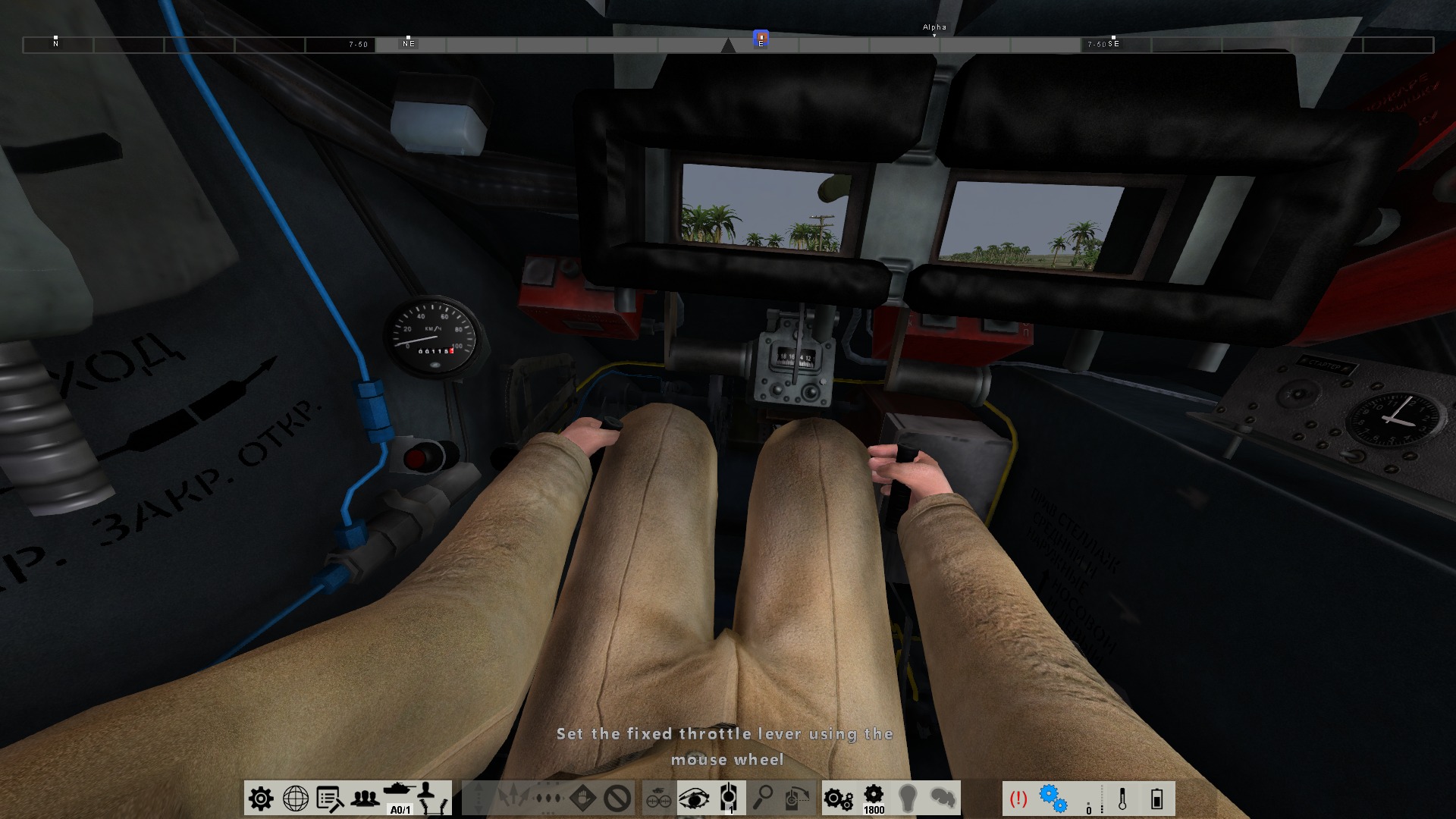 进来后我们作为驾驶员出现在驾驶室里,训练提示“按下W键松开刹车”,我们可以看到底下那排按钮右边有个很大的红色惊叹号,这表示刹车处于激活状态。