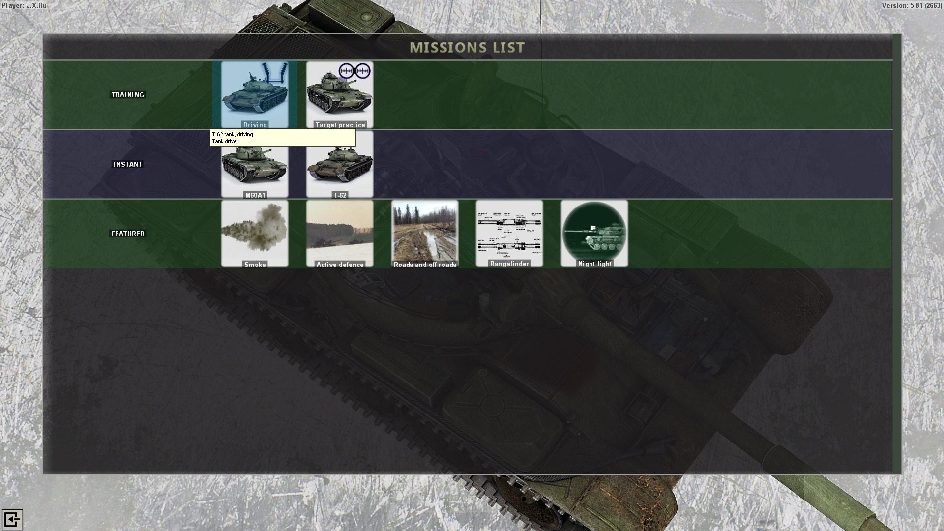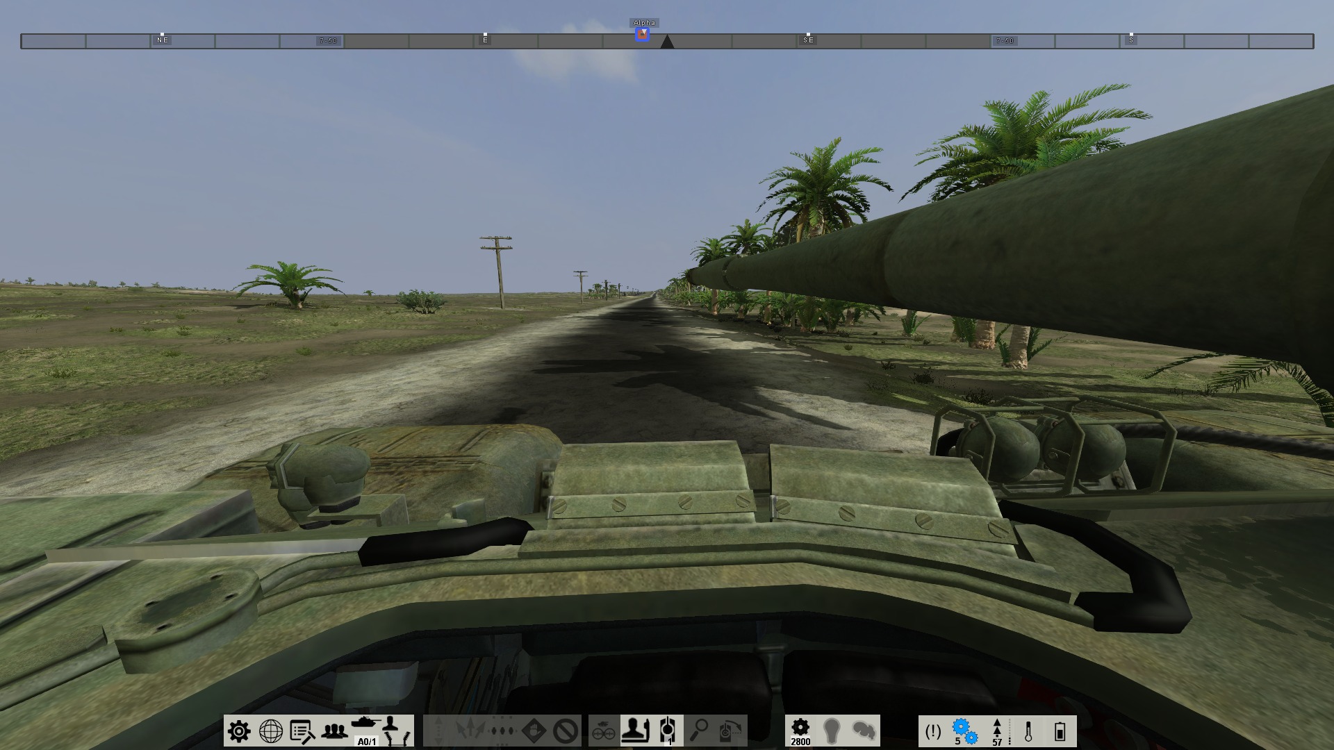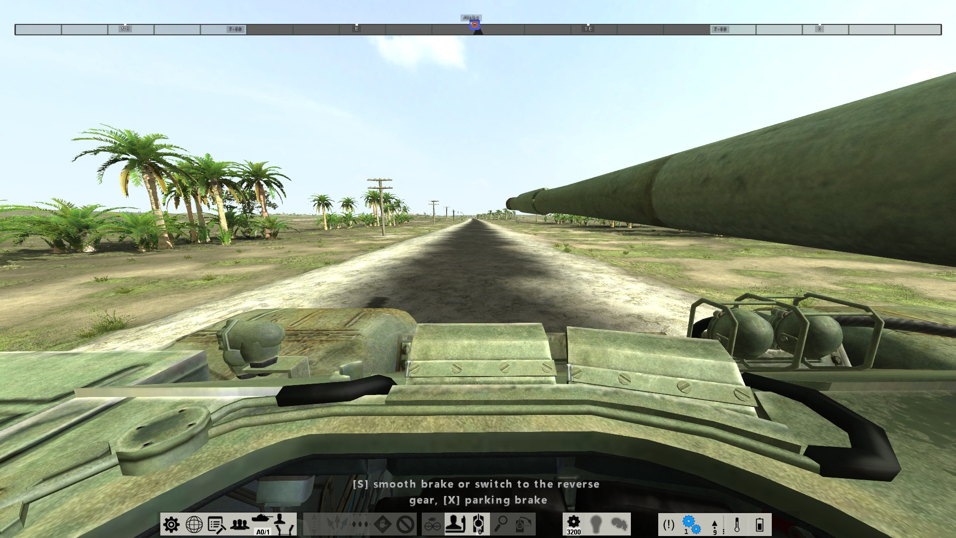 “按下O键切换视野”,比如现在所处的开窗驾驶视野,比潜望镜视野好太多了。“按下TAB键切换近视野”,这样可以更好的看到路面。“按下G键切换手动驾驶模式,在此模式下使用R/F键切换前进挡/倒档”,T-62坦克有5个前进档与1个倒档,1档起步,待发动机转速达到一定时(看中间偏右的齿轮图标上的数字)按R加档,以此类推。在良好地面上,T-62坦克的速度将达到最高55KM/H,但是请大家小心,如果地形地貌过于复杂,请谨慎加档!(地形复杂时使用3档,爬坡时用1或2档,否则容易损坏发动机或根本爬不上坡)
