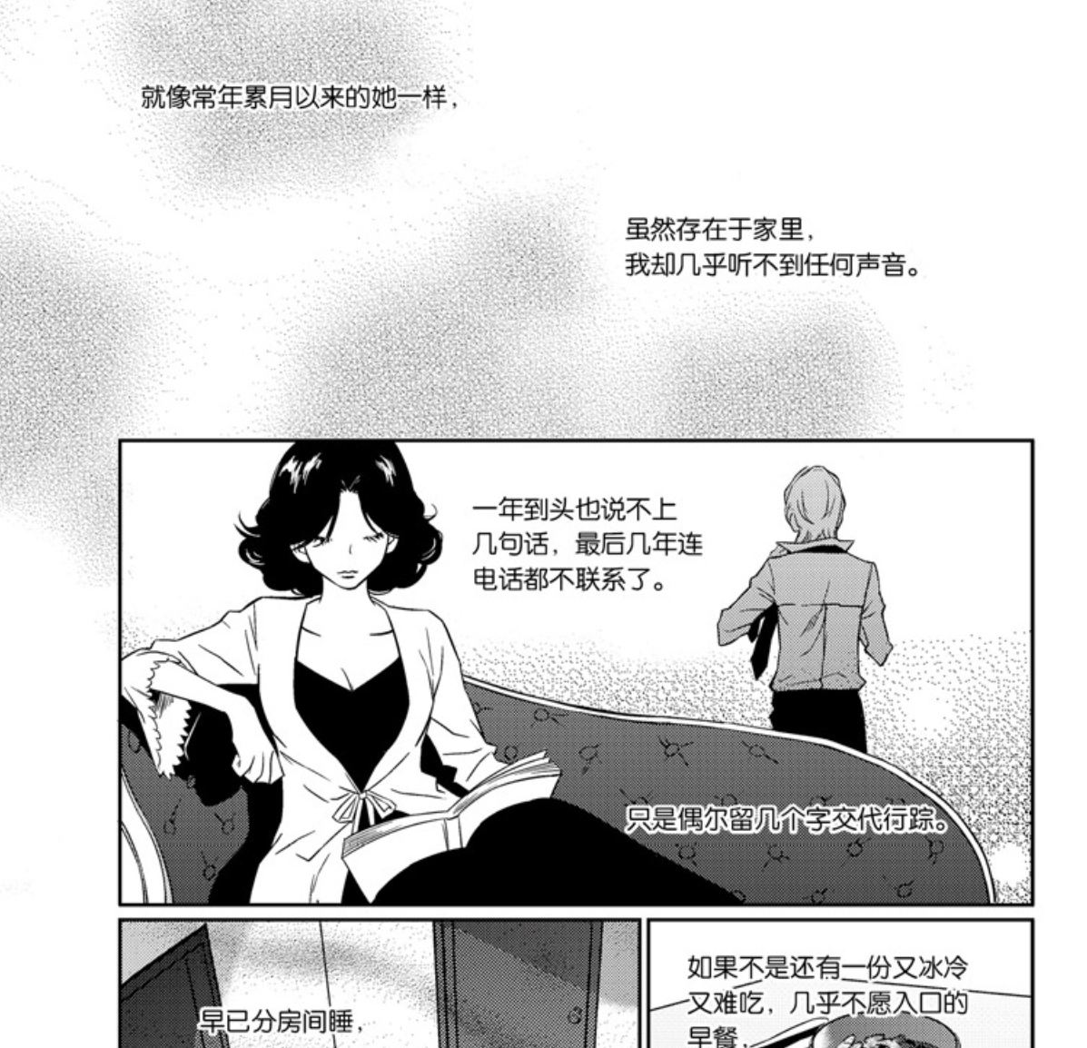 其实这一段如果把文字直接简单粗暴地删掉,就是主角望着空荡荡的房子,看了一会,转头就走了,把其他的留给读者自己体会,这画面的整体效果就会提升许多。这就是画面语言的感染力。但文字的出现就削弱了这种感染力,让读者的注意力集中在文字上,反倒无法好好体会画面语言传达的情感。而文字本身在画面中也不占主要地位,因此就两头不讨好。
