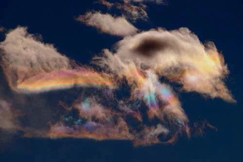 汤主nubbsgalore分享“火彩虹” 系列照片,火彩虹又名环地平弧(circumhorizontal arc),当高空卷云层达到足够高度,且太阳照射卷云层中的冰晶的角度正好为58度时发生的折射罕见现象