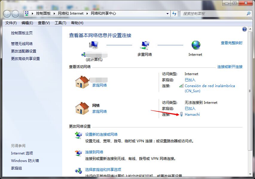 打开网络和共享中心,然后找到hamachi.