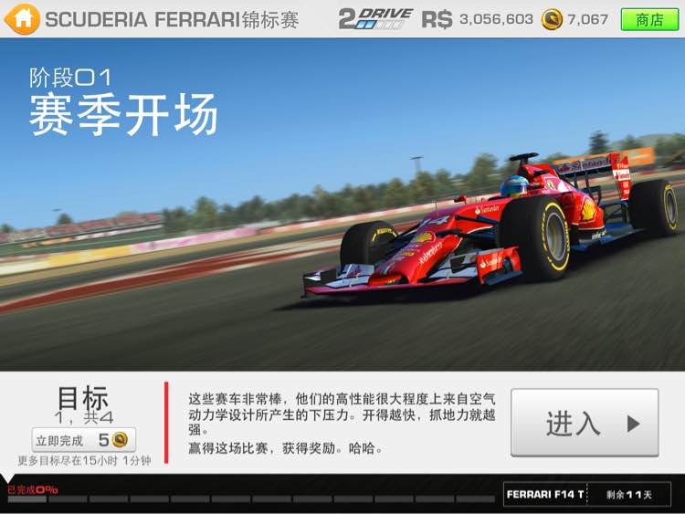 之前法拉利任务,本来应该是第一批做完三大赛车的,结果在最后一辆车的任务还有2天就完成的时候,pad被锁,资料未备份,苦逼的从头来过……紧赶慢赶把前两辆车给拿到手了,最后一辆就没赶上……后来游戏更新,雷诺电动车的跑着实在没激情,就扔了没管。今早一登录,居然又提醒我做法拉利……简直奇迹啊~