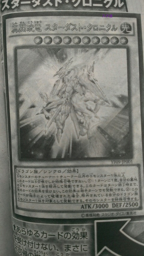 【同调怪调整+调整以外的同调怪一只以上】此卡只能同调召唤。 ①一回合一次,将墓地里的一只同调怪除外,这回合结束之前,此卡不受其他卡的效果影响,这个效果在对方回合也可以使用 ②此卡被对方破坏的场合,可以以被自己除外的一只龙族同调怪为对象发动,将那只怪兽特殊召唤。 【大概是这样吧】