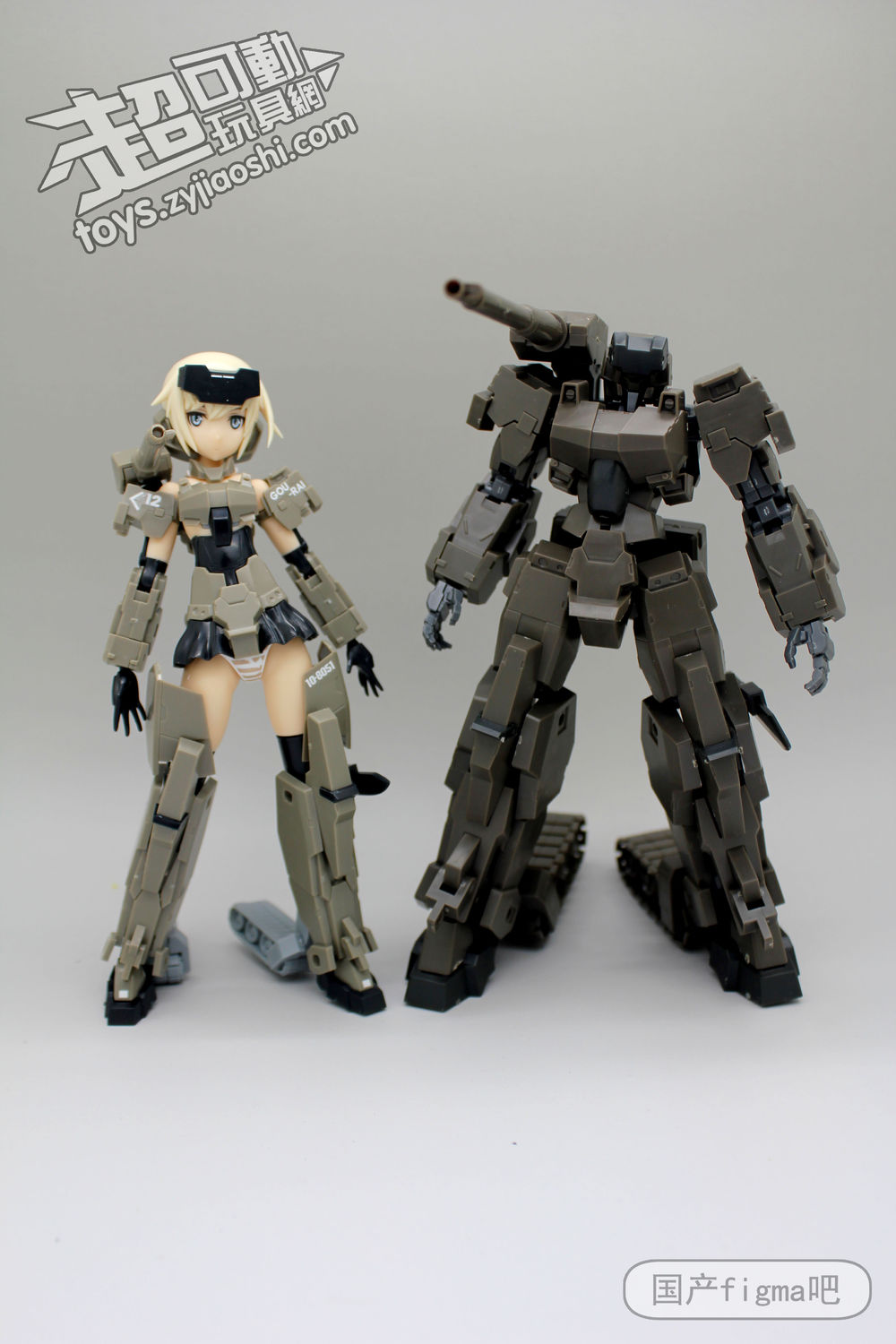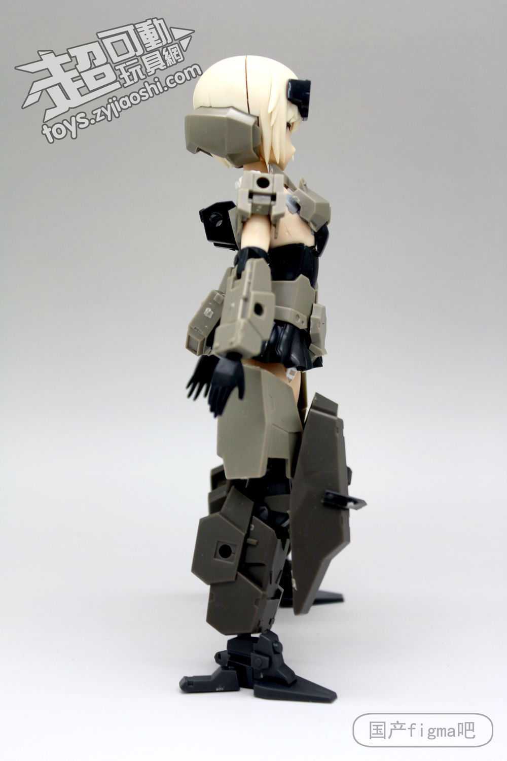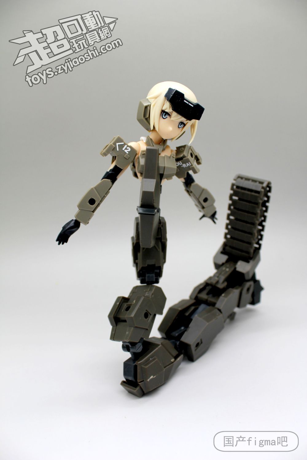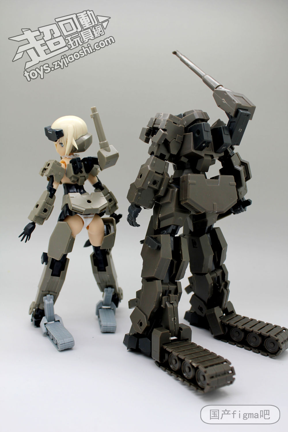 但仔细看,其实相似处非常多,从侧面来看,可以看到肩甲、腿甲、手臂、履带等等结构基本都是一样的,只不过机娘版本对粗矿的曲线做了调整,粗壮的手臂和腿部改细了。