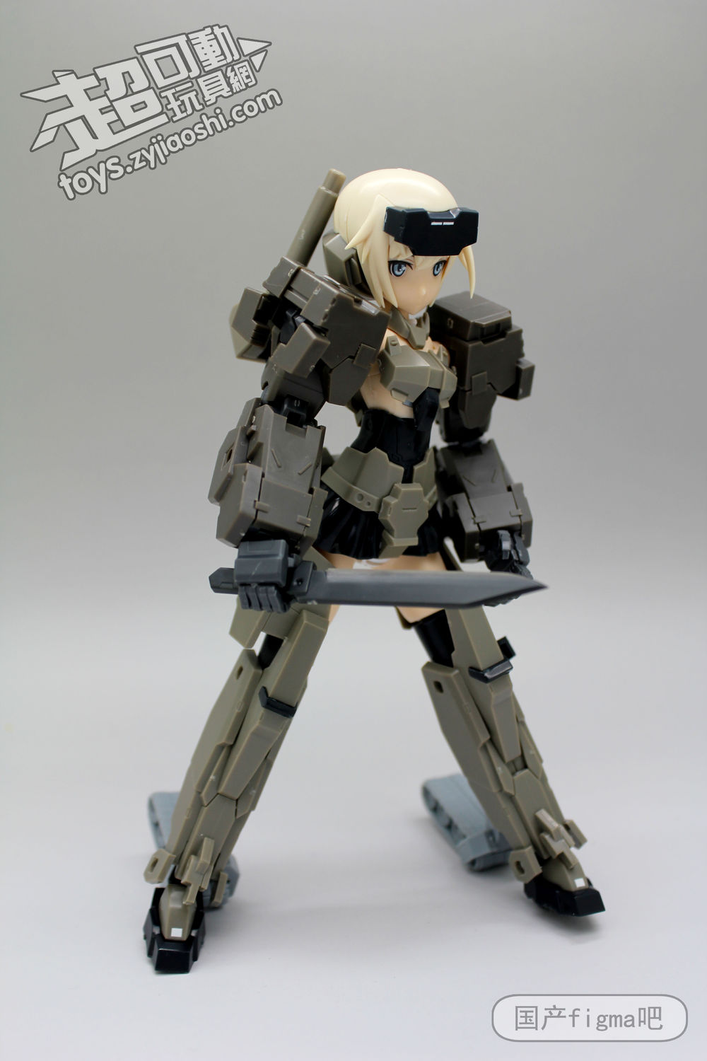 但仔细看,其实相似处非常多,从侧面来看,可以看到肩甲、腿甲、手臂、履带等等结构基本都是一样的,只不过机娘版本对粗矿的曲线做了调整,粗壮的手臂和腿部改细了。细看,放刀的位置和接口都是一样的,只不过统统小了一号。