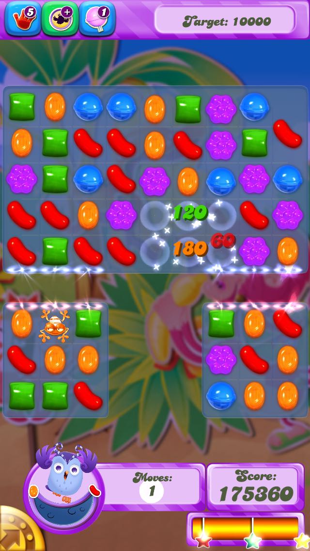 627是有点难度的,策略是在第一次满月前,尽量能喂饱青蛙;同时在满月5步期间,出1个彩球+单色,再次喂饱青蛙,这样消掉2边的甘草,最后等第二次满月全清jelly。但这关的问题在于猫头鹰吃9个糖果就倒,所以开局后的运气很重要。