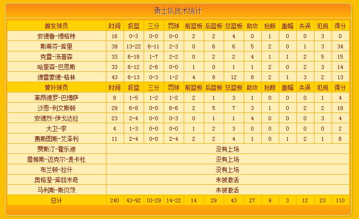 库里首节三分球4投3中,一人得了11分。