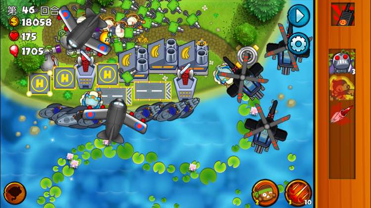 用的银行,50只叠在一块,用了全部水猴,船,工程师,狙击手,4个猴镇。