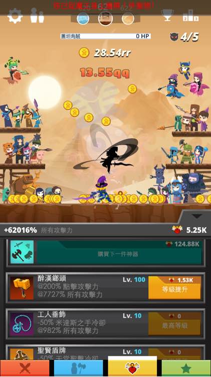 在此之前一直是为了刷出天神之药而努力,一直蜕变,在我买出第27个神器的时候终于给我买出天神药了,之前我神器攻击力加成是2W多一点,可以打到将近2300关;现在把天神药升级上去,攻击力到6W多,我发现也就2300多关,连2350关都上不去。
