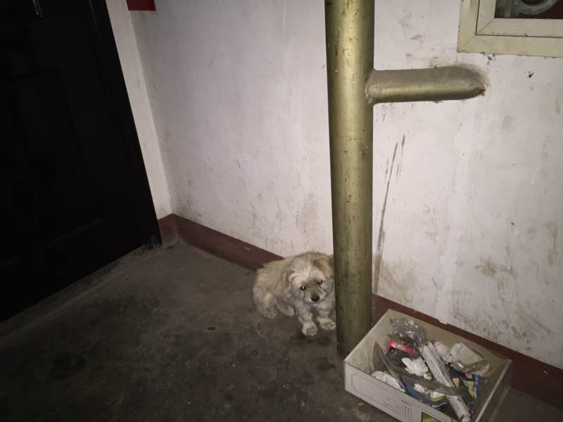 楼道里蹲着一只狗狗,不知道是谁的,估计迷路了,希望主人能看到将它带回。