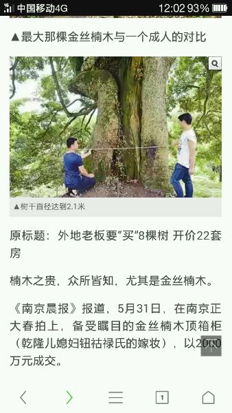 《南京晨报》报道,5月31日,在南京正大春拍上,备受瞩目的金丝楠木顶箱柜(乾隆儿媳妇钮祜禄氏的嫁妆),以2000万元成交。
