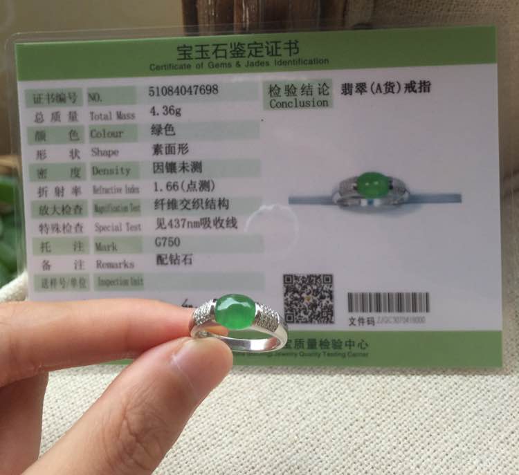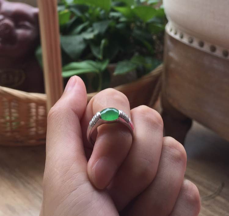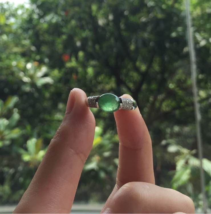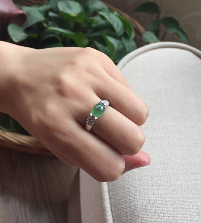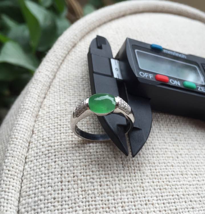 冰种绿蛋,完美无纹裂,透光微有棉渣,裸蛋尺寸7.5*6.6*3.5mm,重4.36g,手寸12.5号,价6800