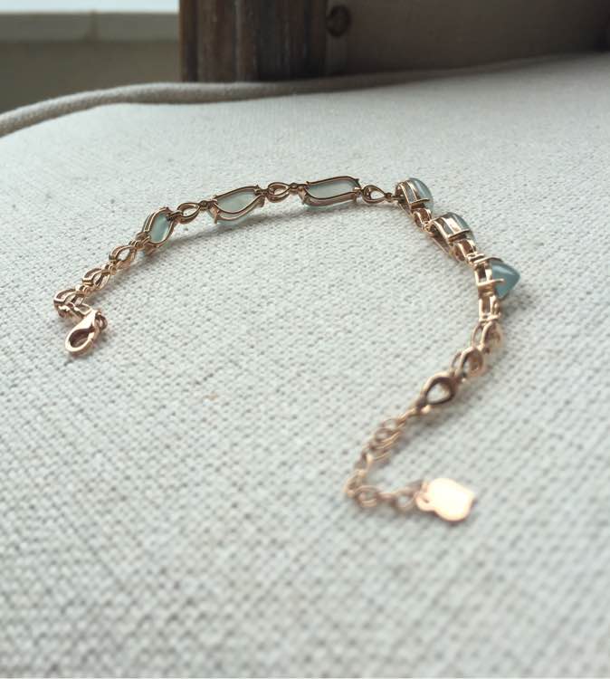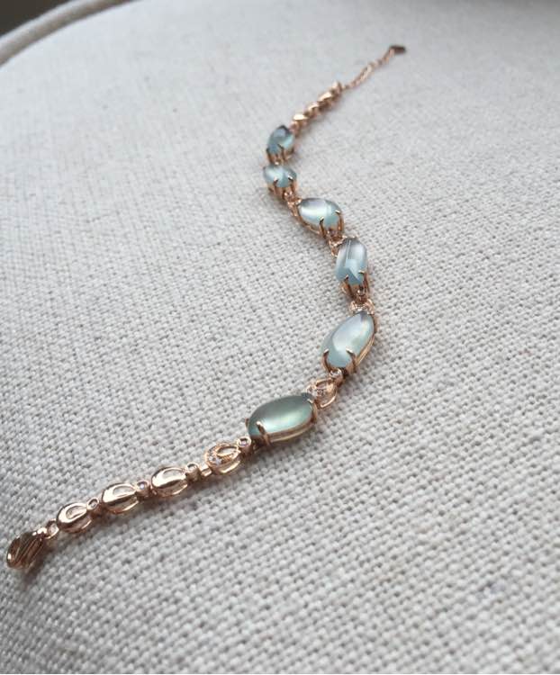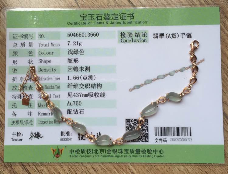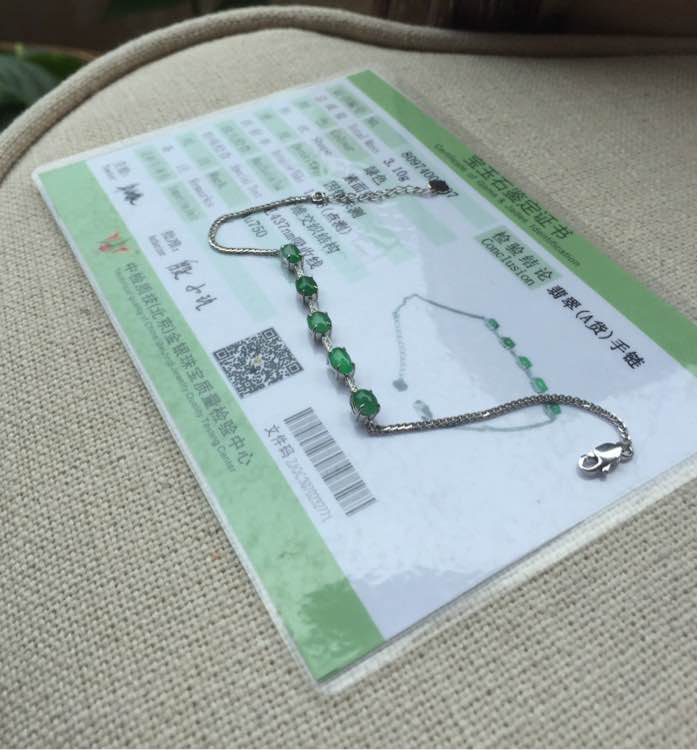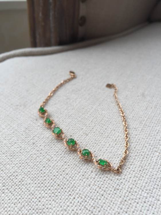 满绿手链,冰种起光,完美无裂,透光有棉渣。裸石最大:6*3.7*2mm,最小5.3*3.4*1.5mm,重3.10g,18k金钻镶嵌。蛋面种水色都蛮好,但是形状不规整,偏小,适合小手腕美女,价3500元