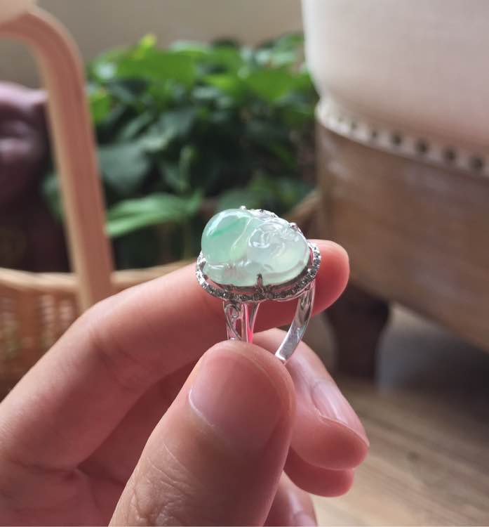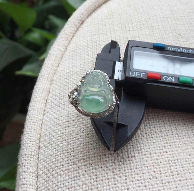 冰种佛爷爷戒指,肚子上飘了甜甜的绿,18k金钻镶嵌,裸石14.2*12.34.7mm,重3.09g,手寸13号,价5000