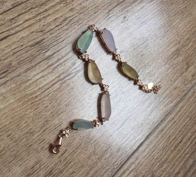 冰种三彩随型手链,18k金钻镶嵌,裸蛋最大18.5*6.6*4.1mm,最小13.2*6*4.7mm,重10.27g,价5500