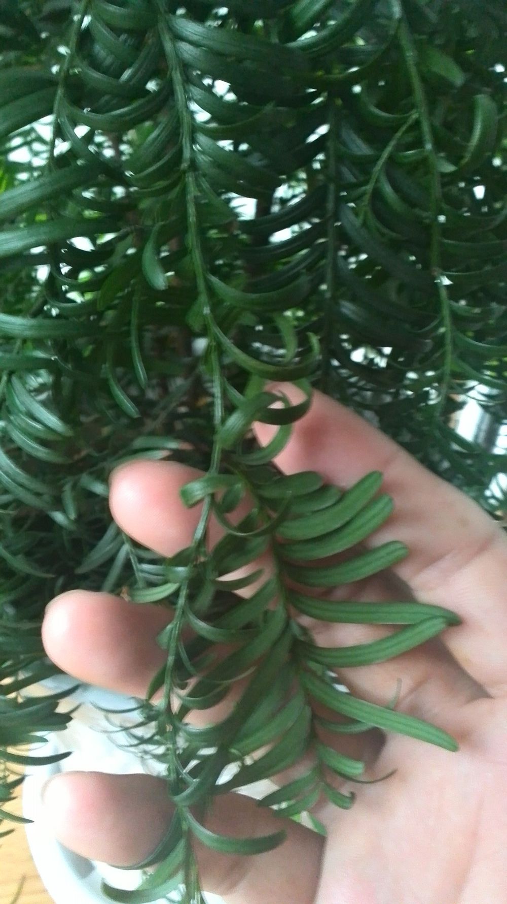 看我的红豆杉,3年前比你这棵还小,现在连盆1米2了,因为在卧室养着,从来没往页面上喷过水,老叶比你的还要卷曲,像干枯了一样;不过新叶长出来就好些了。