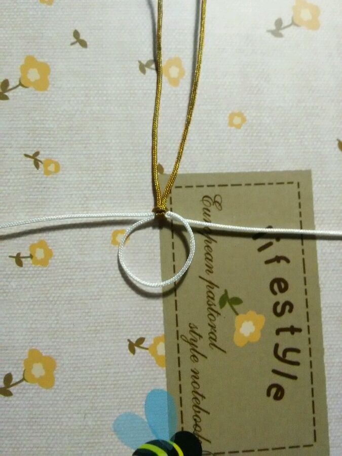 白线对折交叉,另取一根短线,挂线编雀头结。随便找的线头,20到30cm左右。