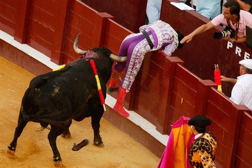 。人有智慧,牛有速度和力量,但人发现了牛的缺陷是对红色的刺激和转弯不灵便,所以用红布来挑逗牛,20个回合后累得牛体力大减,再用花标来刺,进一步放血,最后很多牛几乎在原地不动的状况下被剑刺入要害而倒地毙命。千篇一律,看起来好像斗败了体型庞大力量威猛的牛而沾沾自喜,有本事你不用工具,赤手空拳跟牛斗啊!有本事你拿红布和剑跟狮子斗啊!所以说人是利用了自己的智慧的,SB才拿红布和剑跟狮子斗呢,换杆来福枪差不多。所以竞赛的规则是人订的,订得不能让人吃亏。咱武松那才真本事,别说老虎,这些斗牛士让他们和狗斗都难免有几个不受伤的。长期以来这种比赛的胜负率是999:1,用奥运的观点来看,这种绝对一边倒没什么看头的竞赛是会被取消项目的,我真的很想看到牛能够胜一场!
