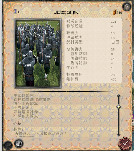 这两种将领卫队都是产地免维护的,下马的没写罢了(亲测免维护),由于拜拜建造将军的时间只有8个回合,所以我极力推荐不要造骑马的将领卫队,而是只造下马的那种。因为骑马的人数达到20多人时,维护费会达到1500左右,但是下马的只会一直维持在725,如果所有的城都有一个将军,上马的会消耗大量的资金,不利于发展。