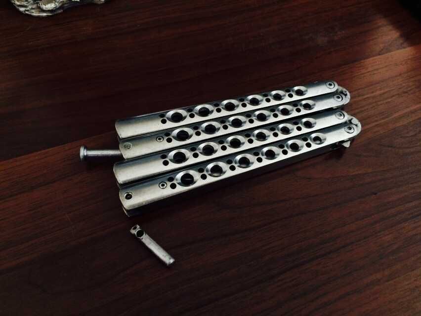 首先这是一把已经维修好蝴蝶刀和一把没有弹簧尾扣螺丝断裂的蝴蝶刀