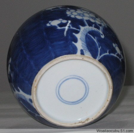 青花冰梅将军罐,高22cm口径8.5cm底径11cm。短颈、直口、饰青花“人”字型篦纹,鼓腹下收,足外撇,盔形盖、宝珠钮,器表青花冰梅,文饰秀雅,胎坚质细,足呈“泥鳅背”状,双圈青花底款,“条刀”内壁修切规整。是清末的一件精品。盖有两处小磕。