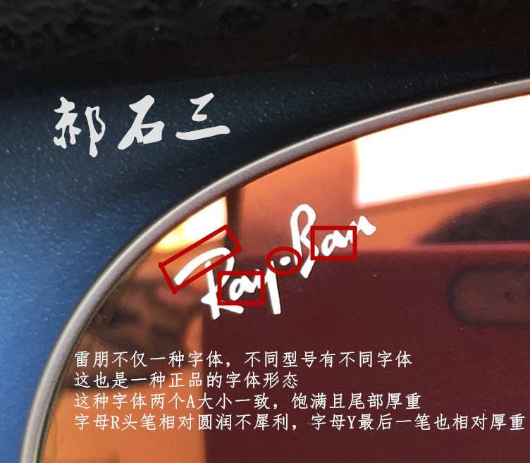 第一:最简单的就是看镜片上的logo。当然还有印刷位置和角度之类的也没有过多赘述,这里只是简单说一下,但掌握以下这几点就足够了。雷朋正品logo首先不止一种字体,现我所见所知的为四种字体,不同型号采用不同字体,雷朋字体最常见的就是带笔锋和收笔的字体,字体书写行云流水,印刷清晰细致,前后两个字母a书写字体不一样,第一个a圆润,第二个a相对扁,字母a中间的空间呈狭小椭圆型。ray与ban之间的点呈椭圆状且距离紧凑。字母R、B、P是在一条水平线上;另一种字体R并没有笔锋,两个a大小一致,圆润饱满,字体粗细结合,书写流畅,具体鉴别方式见图。