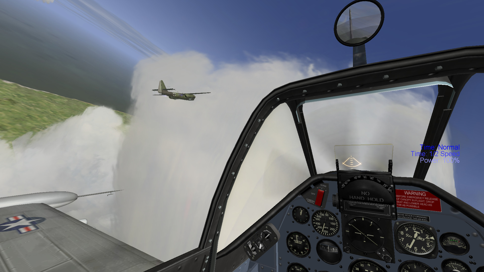 刚才飞了一下以前安装的一个MOD机—— PA-48 Enforcer。第一眼印象是长得很像P-51,不过变成了反转螺旋桨,翼尖多了两个油箱。武器配置也比较多,可以换成4x12.7mm勃朗宁机枪、4x20mm西斯帕诺机炮或者2x40mm博福斯机炮。整体操控性和P-51D差不多,而性能则完全变态(相对于螺旋桨飞机),1000m以下速度基本上在490km/h以上,而在7000m以上的高空,速度更是分分钟上720km/h。测试时的最大平飞速度达到了912km/h(接近8820m),掉零件速度为1235km/h