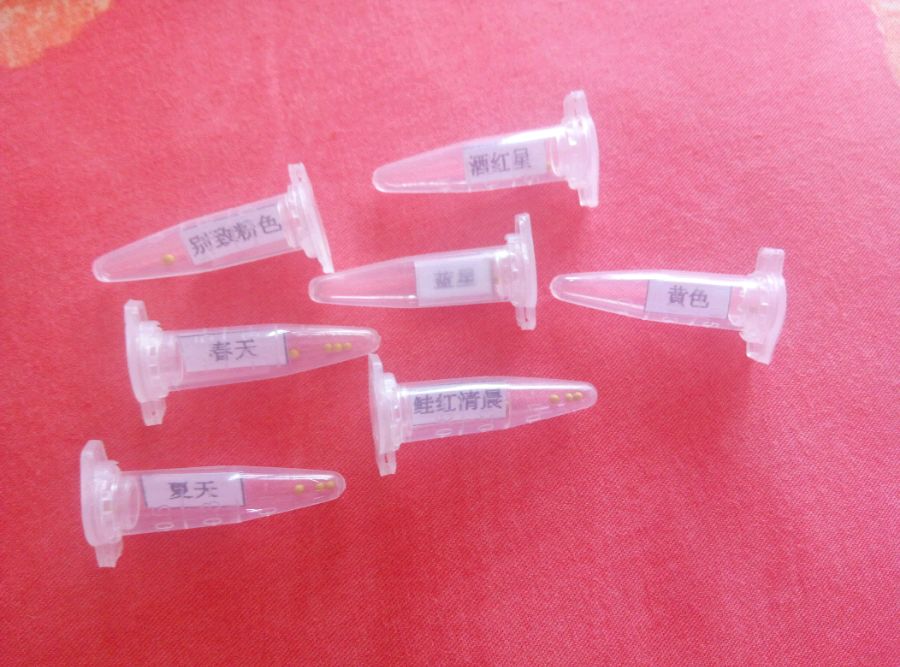 7月25日下午多云,7个品种的矮牛各播两颗。矮牵牛的品种分别为海市蜃楼系列酒红星、春天、夏天、蓝星、黄色、别致粉色、鲑红清晨。道先把一次性杯子剪掉1/3,底部打孔,再把写有品种名称标签分别贴到杯子上以免品种混淆。直接把买来的靓土填满杯子压紧,水浇透。最后一步把丸化的种子分别放在土的表面,不要覆土,一个杯子放一颗。 黄色的那一小粒就是种子了。 托盘里面放入不到一厘米的清水,让每个杯子都泡在水里保持土壤湿润,便于出苗。