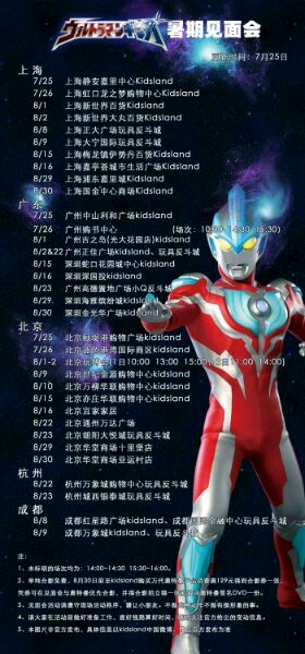 银河奥特曼暑期见面会安排完整版:本周末起每个周末北京、上海、广东以及杭州、成都再次展开见面会。合影免费,830前在kidsland买奥特曼满129送券,凭券可在合影时得拍立得以及银河签名银河国语DVD。本图非官方具体以官方为准。希望奥迷们转一下互相告知一下,和奥特曼见面吧!!
