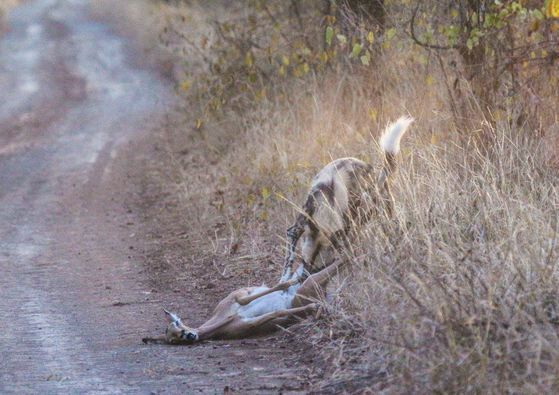 两猎豹抢野狗食物