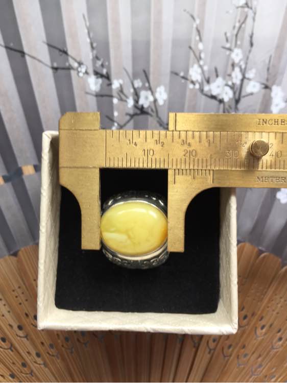 925银饕餮纹戒托,鸡油黄蜜蜡戒面