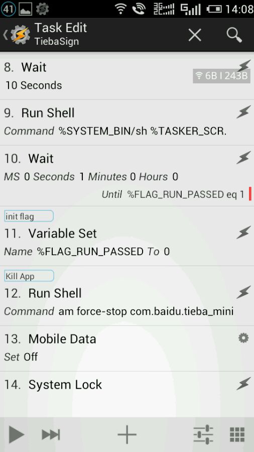 3. tasker 好像不会等到脚本执行完才继续下一条,我也说不准。一开始只有一句sh my.sh 的时候还没签完就杀了贴吧然后关屏了,或者是tasker 里看到操作都进行完毕,但模拟触摸的脚本依然在执行。后来改成sh my.sh;echo 1后,用wait until 检测就完全没问题了。