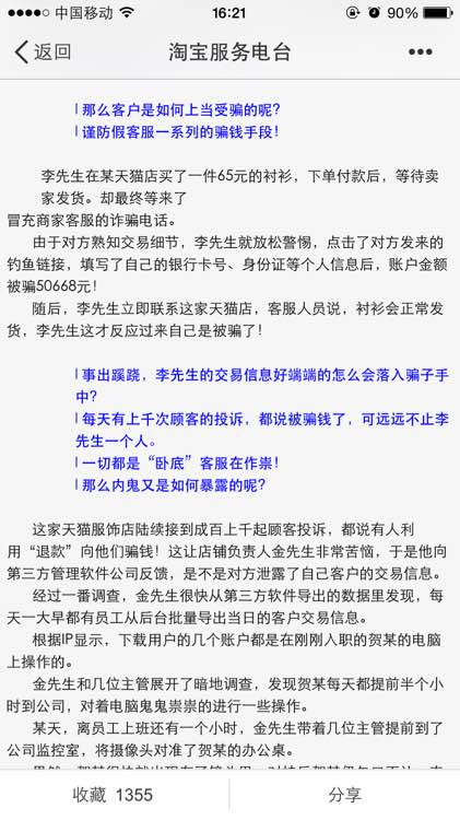 回复 岁月奔流 :总要招客服吧,结果来的不是客服是卧底,天天上班就倒出客户数据,其实就分分钟的事情,不在意都察觉不了。做几天就撤了,除非数量巨大,不然抓都抓不了。我自己觉得是很难避免。我做淘宝是多次收到淘宝的提醒了,要求注意把关。