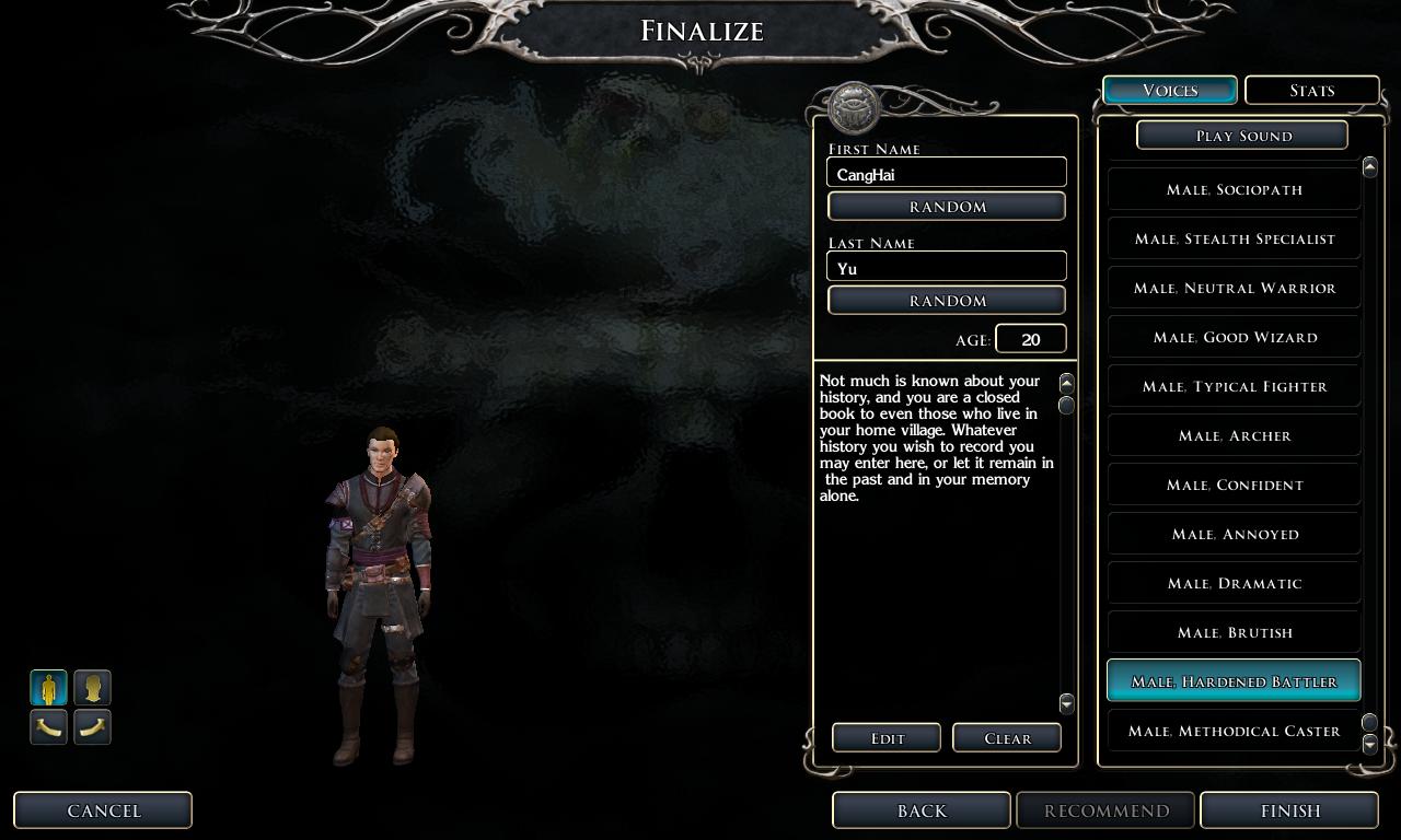 因为用的半身人,考虑到身高因素,名字就取金庸《笑傲江湖》里的余沧海了。在《笑傲江湖》里是恶人的余沧海,我给了他一个洗白的机会,阵营改成守序善了。
