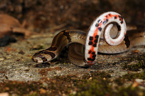 识别要点:体色红褐色?形成多数约等距排列的淡黑褐色横斑,腹面黄白色