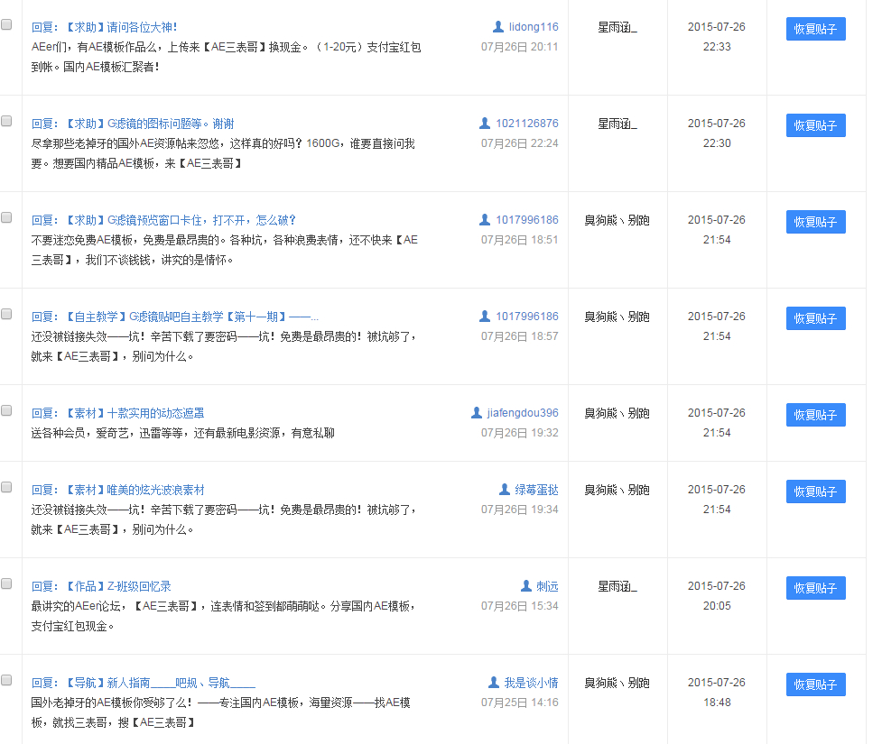 申请理由:实在受不了啦,根本删不过来。还有很多, 让我删了, 全是小号来这里发这个AE三表哥的 广告的。希望通过!