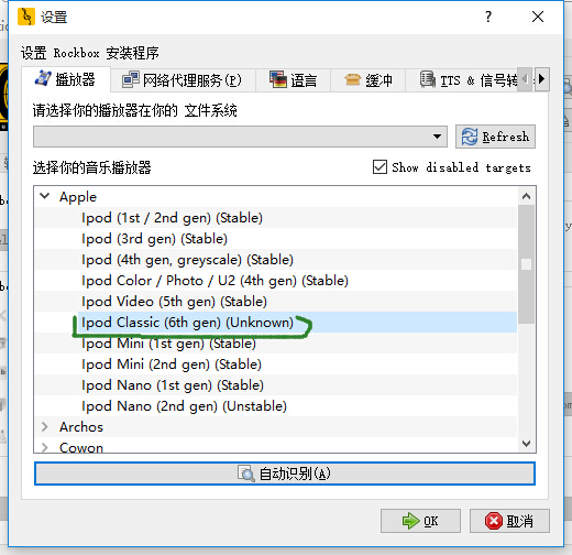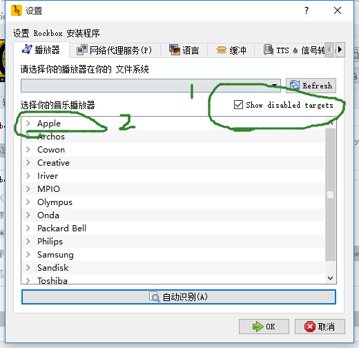 在出来的界面点选Show disabled targets复选框。下面是播放器选择列表,第一个就是apple系列,点开