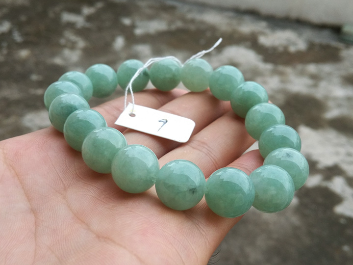 豆绿翡翠大珠子手链手串13mm 【地板价】880元不议价 【尺寸】直径约12.8mm, 18颗 【描述】淡绿色,图片自然光拍摄,个别珠子有纹裂,如果需要的朋友还可以看视频,