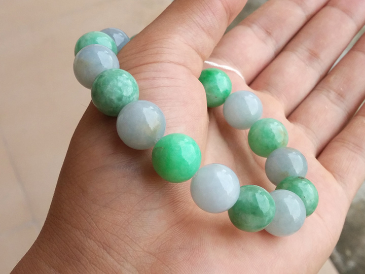 翡翠双彩大珠子手链手串13mm 【地板价】860元不议价 【尺寸】直径约12.7mm, 16颗 【描述】有淡绿色,图片自然光拍摄,个别珠子有纹裂,需要看视频或者重新拍照的吧友可以联系我,