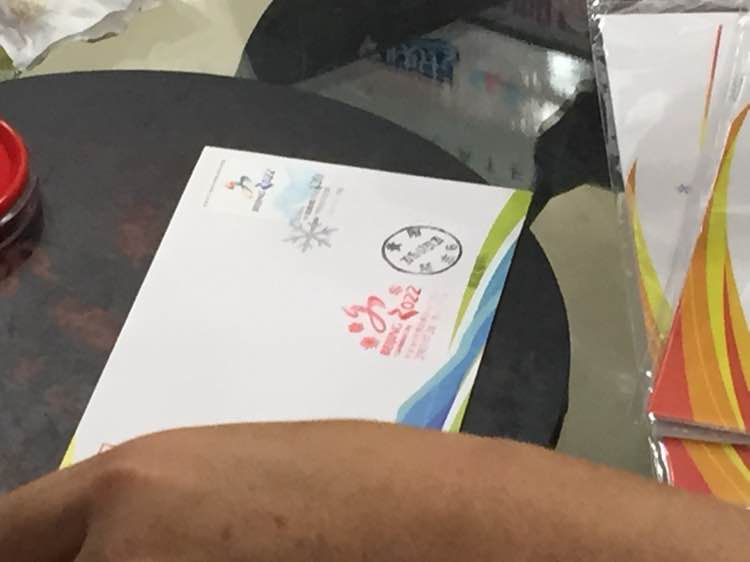 今天北京获得2020年冬奥会举办权,邮总发行特10纪念邮票,全国指定邮局晚上八点出SHOU,在贵阳市唯一的指定邮局排队,邮局为了防止插队还发顺序号,排了一个多小时入手首日封,邮折(内含一个裸方,一个首日封),两个方连,封全部盖上纪念戳寄给自己⋯⋯第一次晚上排队入新邮⋯⋯