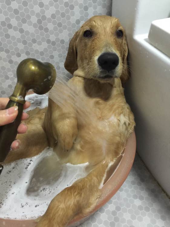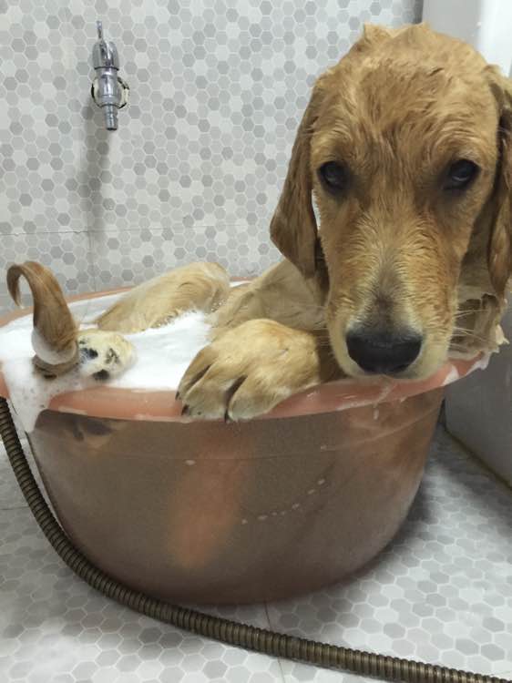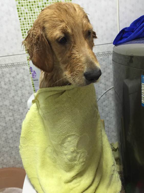 好乖,我家狗连盆都不进,直躲,但是它喜欢吹风,洗完马上跳凳子上等着吹风