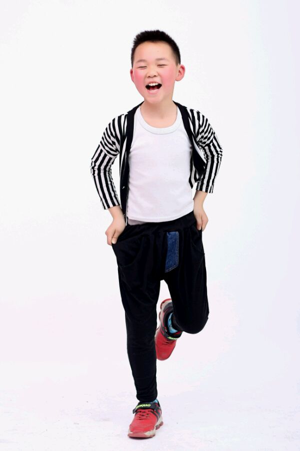 :一盏灯就够了,宝宝站着的,后面是黑背景,灯离背景很远,灯头向下对着宝宝大,灯是三分之一光,相机参数快门160,感光100,光全是小光圈