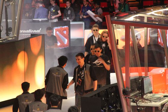 不过当Secret战队登上舞台与EHOME赛前握手时,还是摘下了墨镜。不过这个小小的装扮也体现出了他们的强大自信。