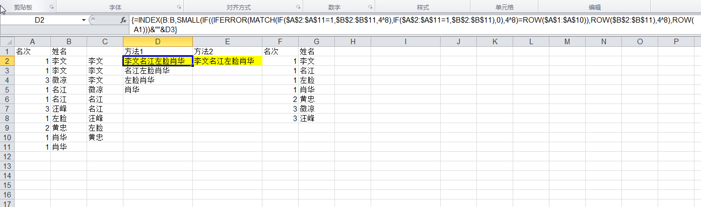 先高级筛选去重,再用index取1 对应的名字,再&连接。、、
