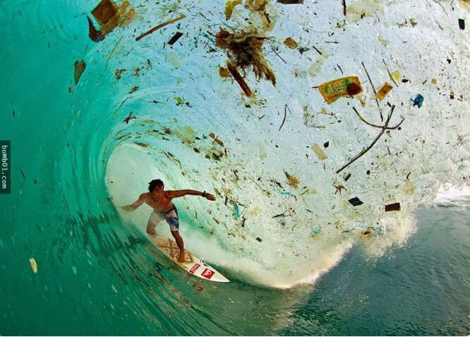 4. 印度尼西亚的爪哇岛是世界上人口最多的岛,垃圾自然也很多,冲浪者无奈只能在垃圾海中冲浪。