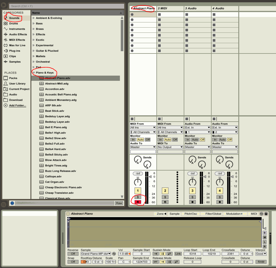 左侧音色栏里面随便拖一个音色到第一条midi轨,比如Sounds下面的Piano & Keys里面,这些音色都适合键盘演奏。确认第一轨下面的Arm按钮是红色。
