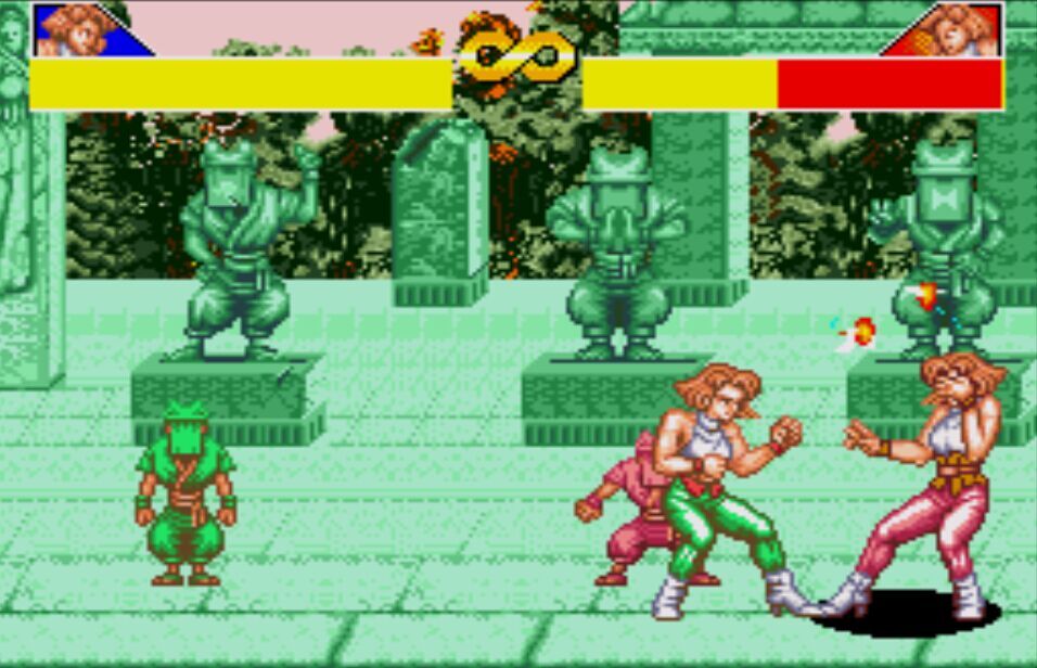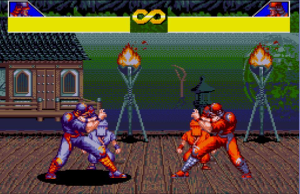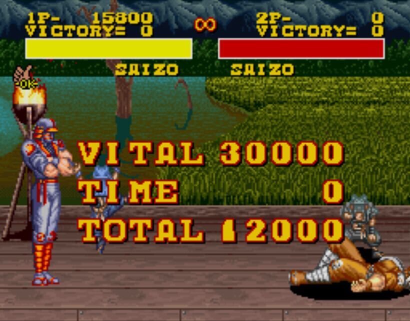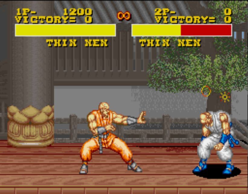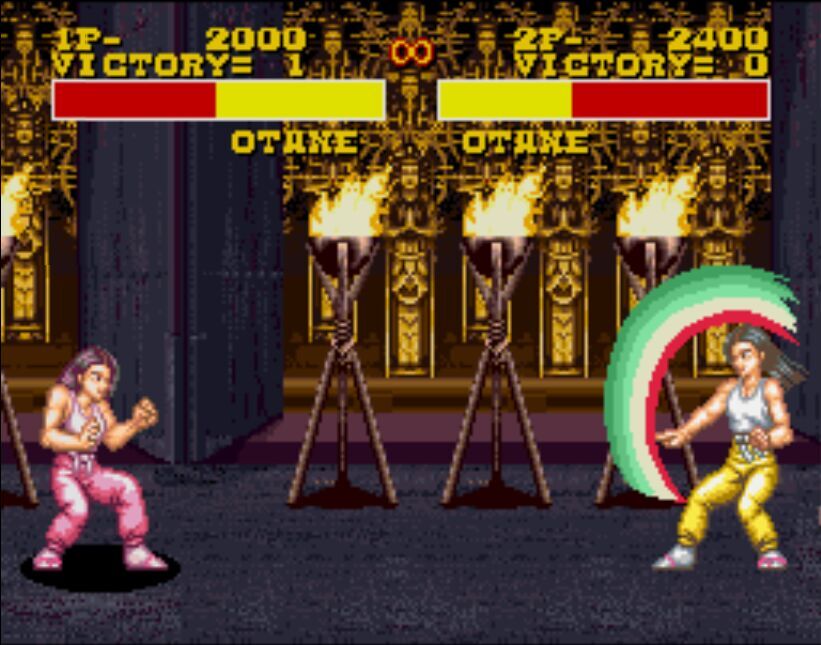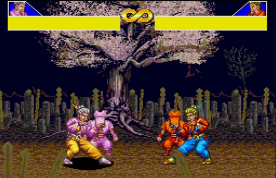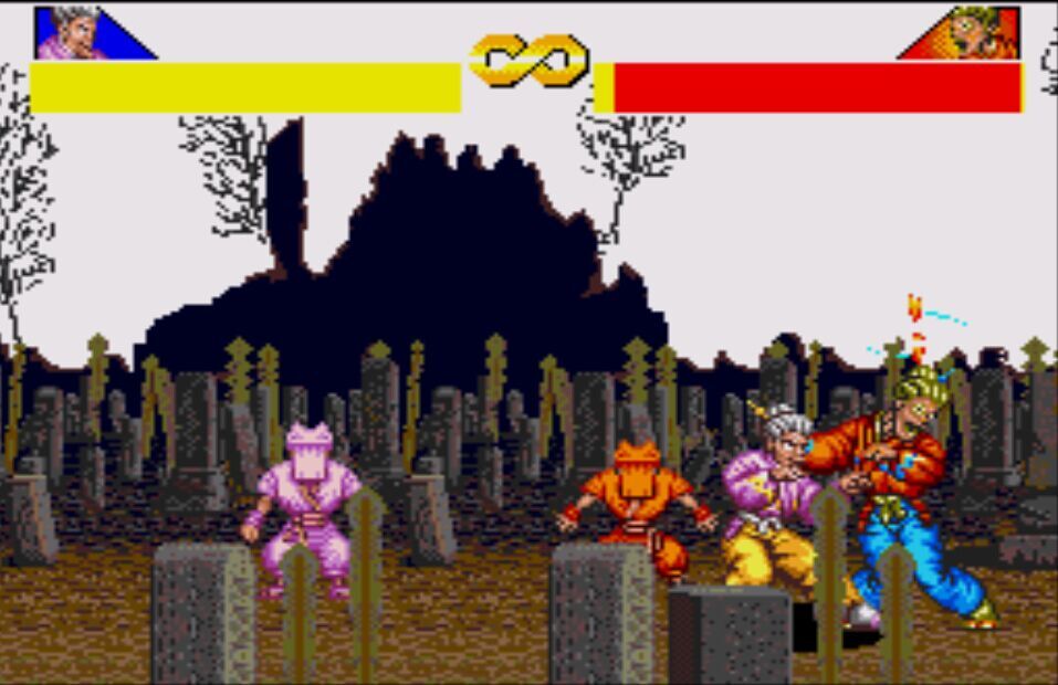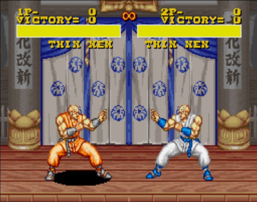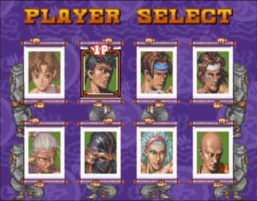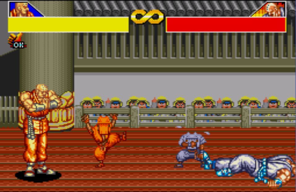 豪血寺一族是阿图拉斯于1993年推出的著名街机格斗游戏,于1994年分别亲自移植到MD、SFC主机上,移植容量都是24Mb。之所以选择这个游戏来对比是因为都是原厂移植、容量相同,有相当高的可比性。楼主不选边站队,好坏每个人的答案不同。楼下上图,上面是MD版,下面是SFC版,吧友尽量不要插楼,每楼我都会做些点评。