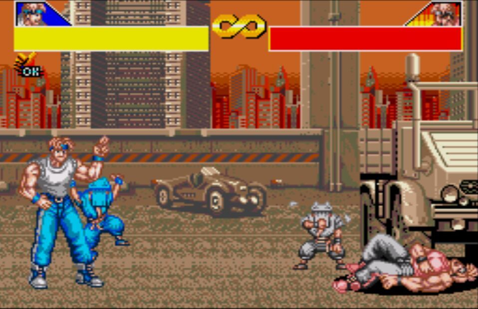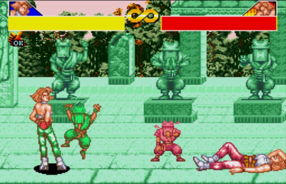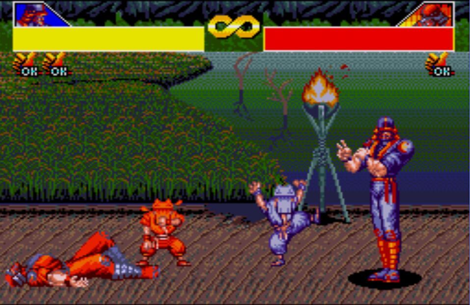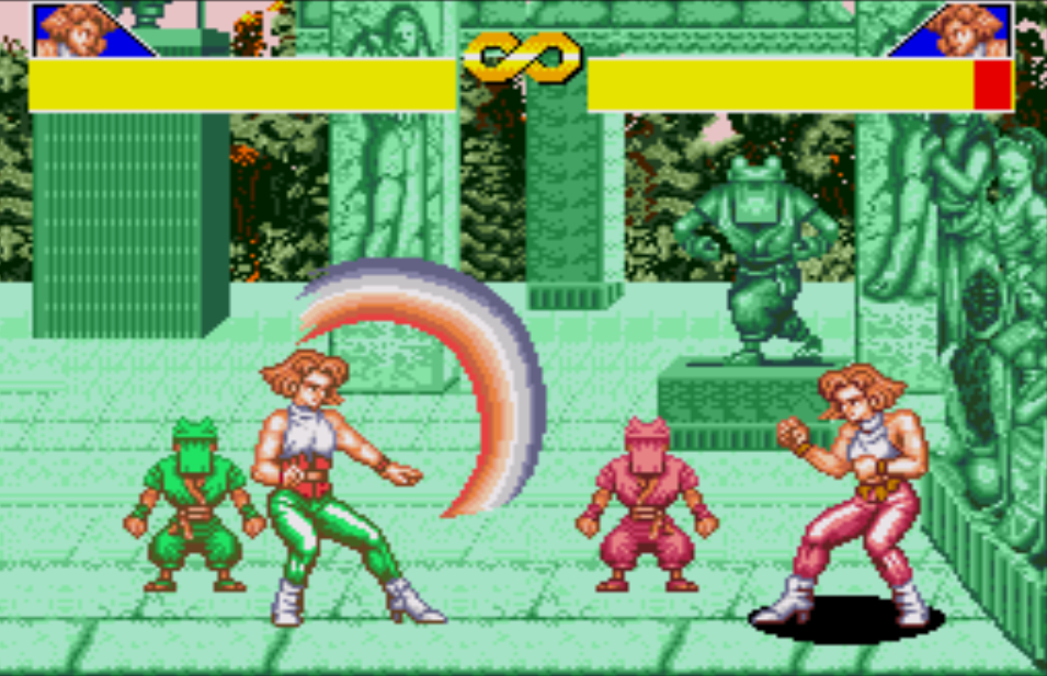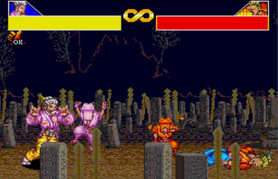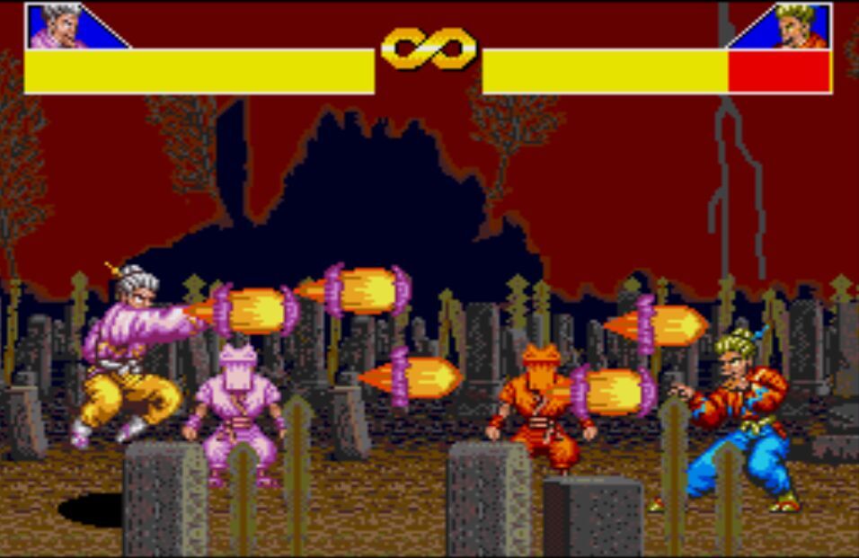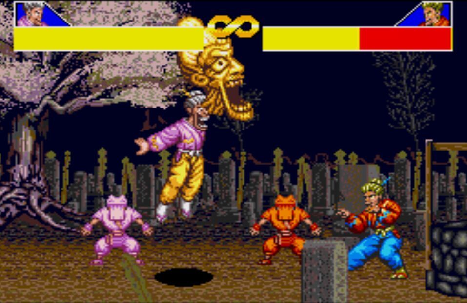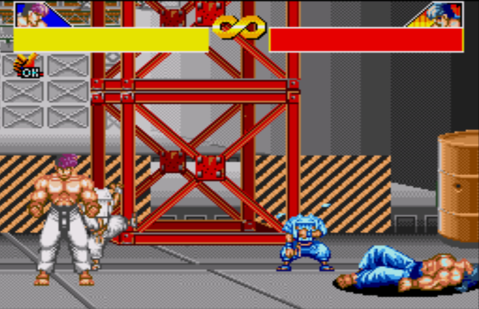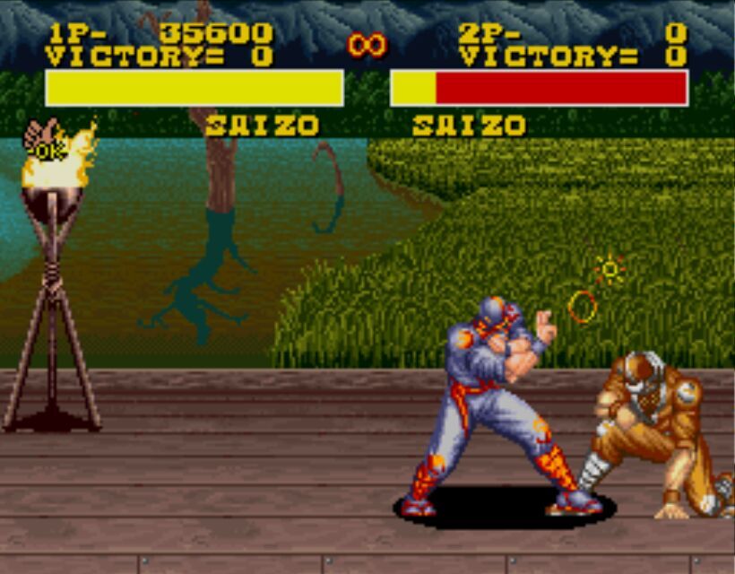豪血寺一族是阿图拉斯于1993年推出的著名街机格斗游戏,于1994年分别亲自移植到MD、SFC主机上,移植容量都是24Mb。之所以选择这个游戏来对比是因为都是原厂移植、容量相同,有相当高的可比性。楼主不选边站队,好坏每个人的答案不同。楼下上图,上面是MD版,下面是SFC版,吧友尽量不要插楼,每楼我都会做些点评。