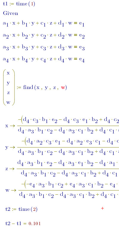 另外,使用shift F9强制进行符号计算并显示显式解,这个过程去掉了将复杂的符号解赋给变量,使其具备计算能力这个过程中,也就是说仅仅使用了CPU,而没有经过内存,于是运算速度就快了许多。而这种使用CPU的符号计算,通过time()是不能测定时间的,所以这种计算到底有多快我也不知道,感觉上是比Maple引擎要慢一些,但肯定比“→”赋值显示的那种方法要快得多。